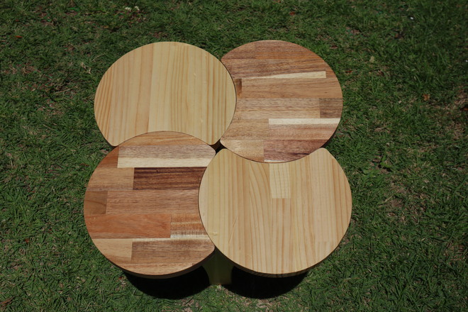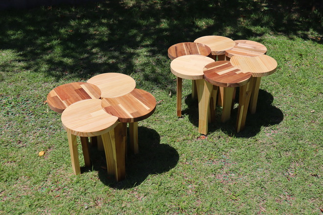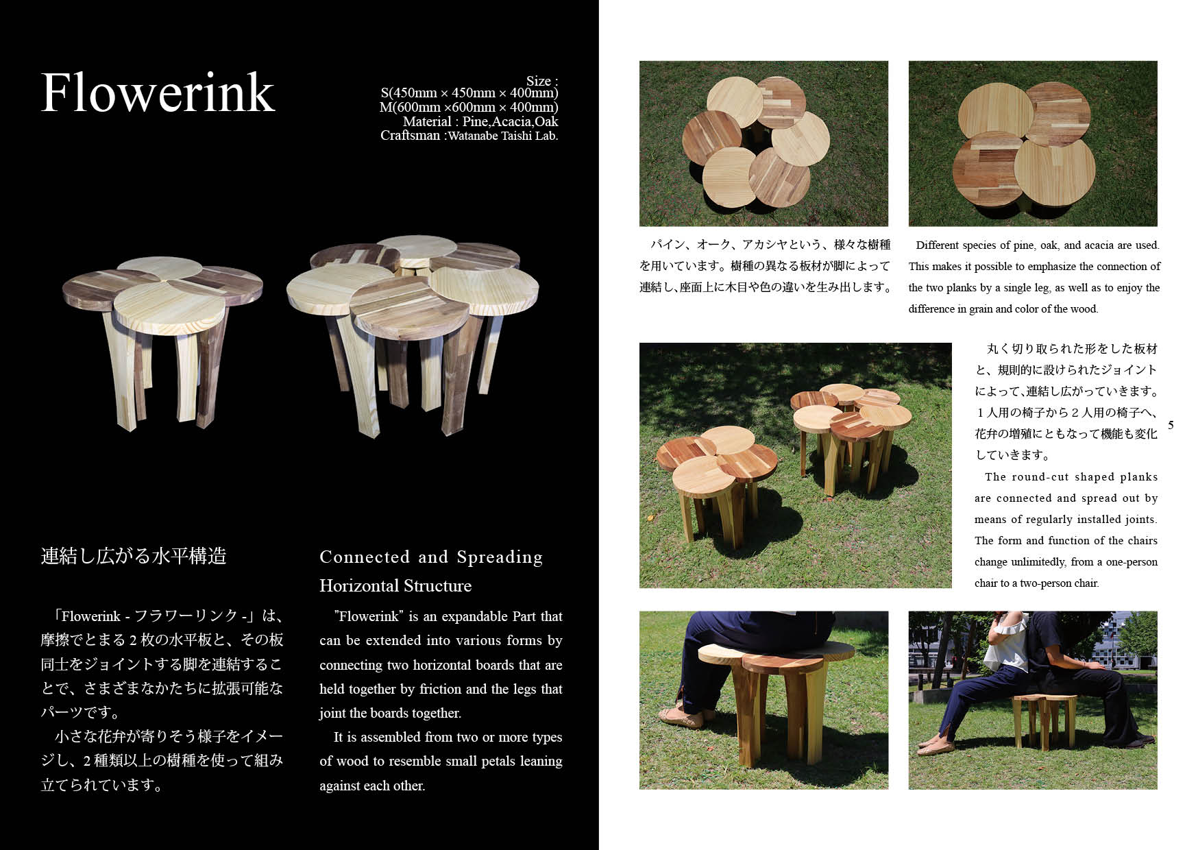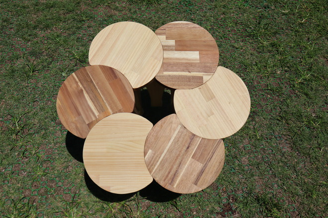 | 「Flowerink -フラワリンク-」は、摩擦でとまる2枚の水平板と、それらをジョイントする脚を連結することで、さまざまなかたちに拡張可能なパーツです。 小さな花弁が寄り添う様子をイメージし、二つ以上の樹種を用いて組み立てられています。 |